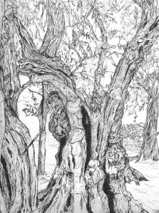 My continuing guilt about not being able to go to the vigil and demonstration on Saturday, has driven me to  more art and I have been  drawing olive trees.