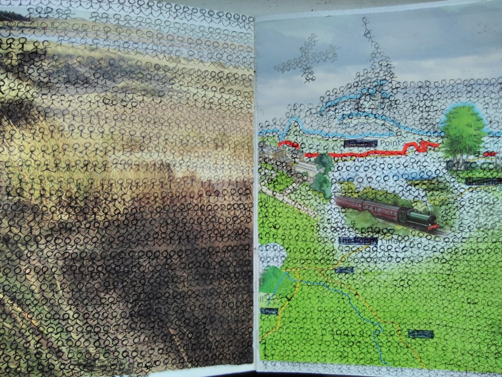 I am using this residency to try to make sense of why I am increasingly drawn to making repetitive, continuous pieces of work, for example filling little books with thousands of tiny stick people to represent the growing numbers of displaced people, drawing each months news on a very long roll of paper and constructing a hopefully miles long umbilical cord made from sustainable rubbish and other discarded and secondhand materials.