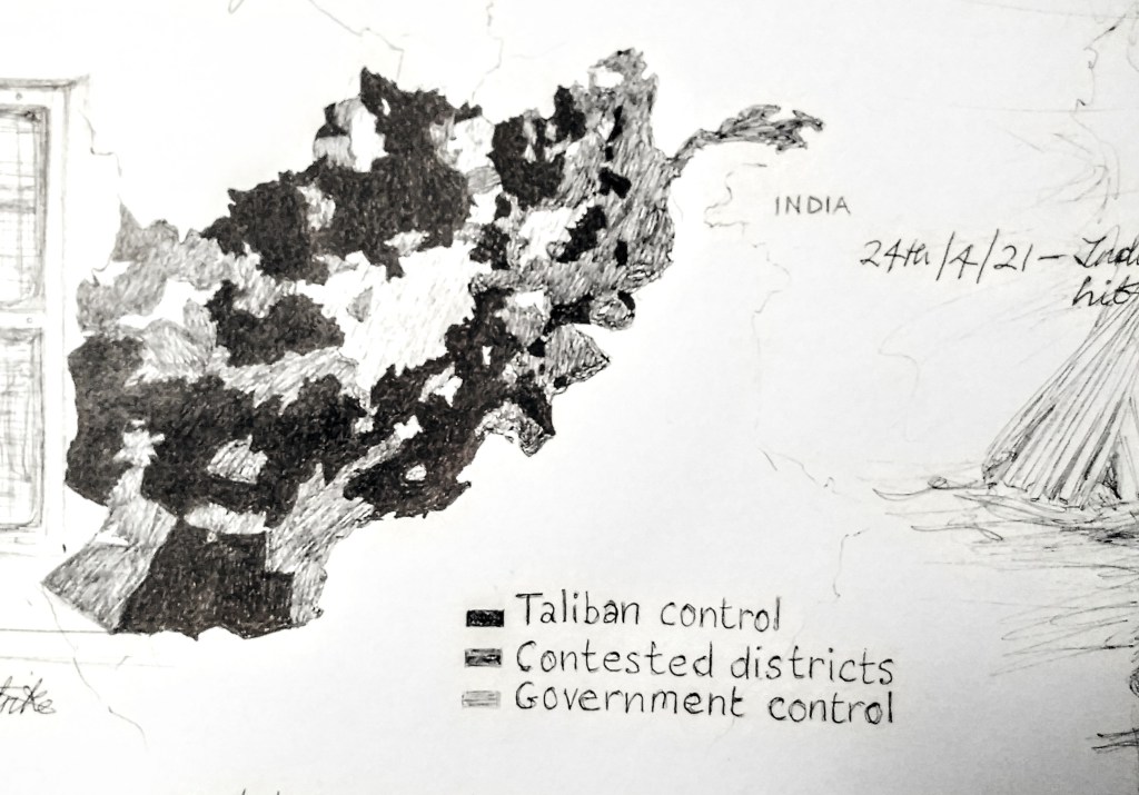 The current tragedy of Afghanistan acutely demonstrates this. I drew the map of Afghanistan above, as part of the continuous drawing of the news, when the US followed by the UK, announced their withdrawal. It is clear that already most of Afghanistan was under Taliban control or contested, with very little land under government control. We had already lost that war. A war that involved our culpability in the mass murder of civilians, torture and other atrocities. We have forgotten these facts, we have forgotten the people who supported us in this war, we have forgotten about the borders that we created and nobody seems to remember that we supported the Mujahideen in Afghanistan for decades and then changed sides to fight against them.