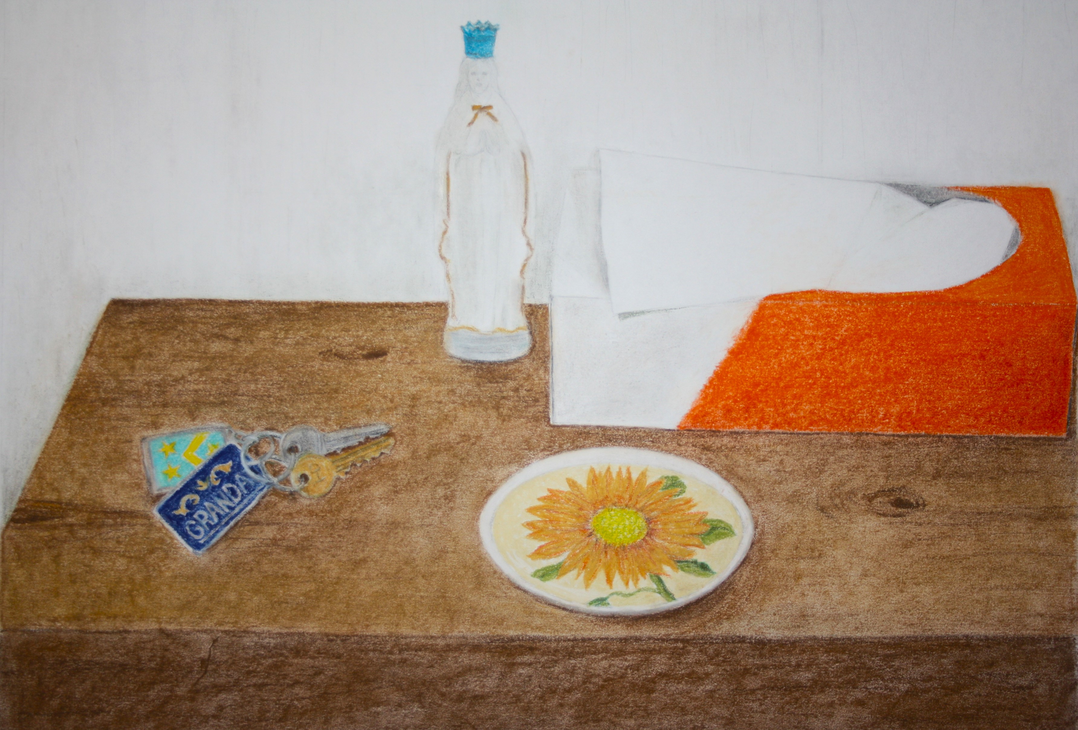 A Pastel drawing of my late Father in Law, PJ, Big Peter’s Bedside Cabinet. These are the items that he did have on his cabinet full of symbolic meaning about safety, security, spirituality and love; speaking about class and culture on a personal level.