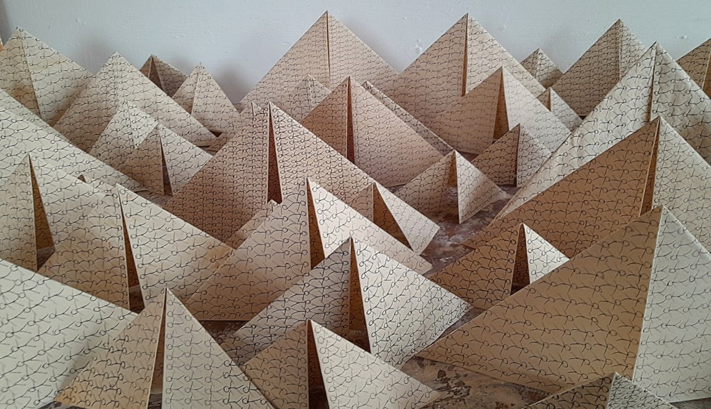 I have been counting and drawing displaced people in the form of stick people onto these origami tents. I am working hard to reach one tenth of the estimated 632,700 people who have been forcibly displaced since March 2025 in Palestine (UNRWA). At least 1.9 million people, about 90 per cent of the population across the Gaza Strip have been displaced during the genocide. Many have been displaced repeatedly, some 10 times or more. Since the recent displacement orders were issued, more people have been forced to flee in search of safety. Thousands of people have been killed and injured whilst sheltering as refugees in UNRWA facilities. This will be part of the exhibition for The Independents Biennial in Liverpool.