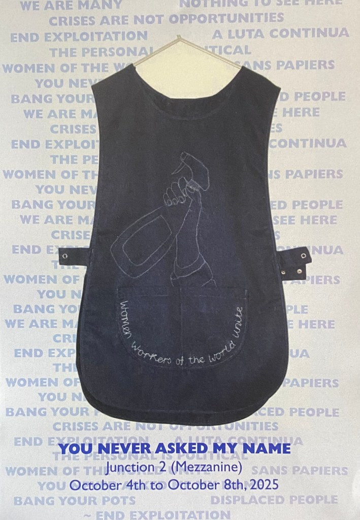 Jill invites you to wear the dark blue tabards. Jill will discuss how she has used these tabards as a kind of canvas to draw and stitch onto with words and images about workers rights and migration, as a tool for solidarity and to investigate the everyday experience of wearing them.